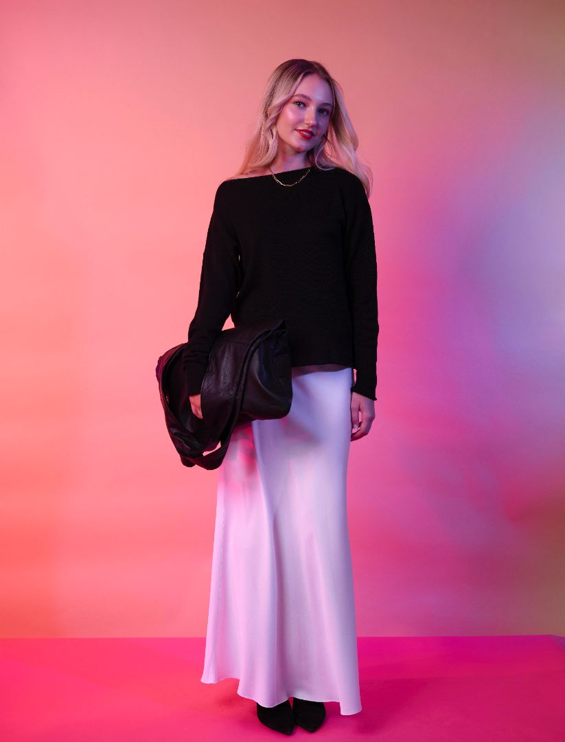 Go with the flow in The Rosie Skirt. Cut on the bias to a maxi length for a flattering fit with ease. The soft silky fabric makes it perfect for everyday dressing- tucked in tee, chunky sandals and a leather jacket for a day time look, transform into an evening look with our slash neck, boots and blazer. We have you covered for every occasion…