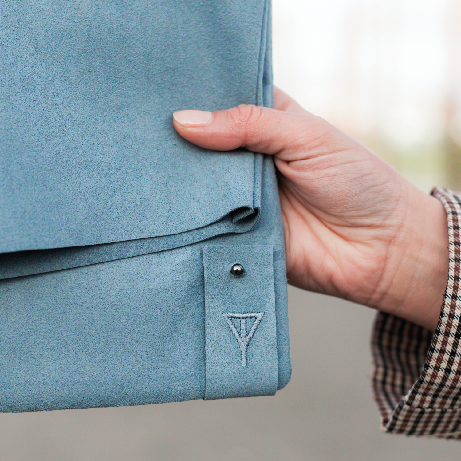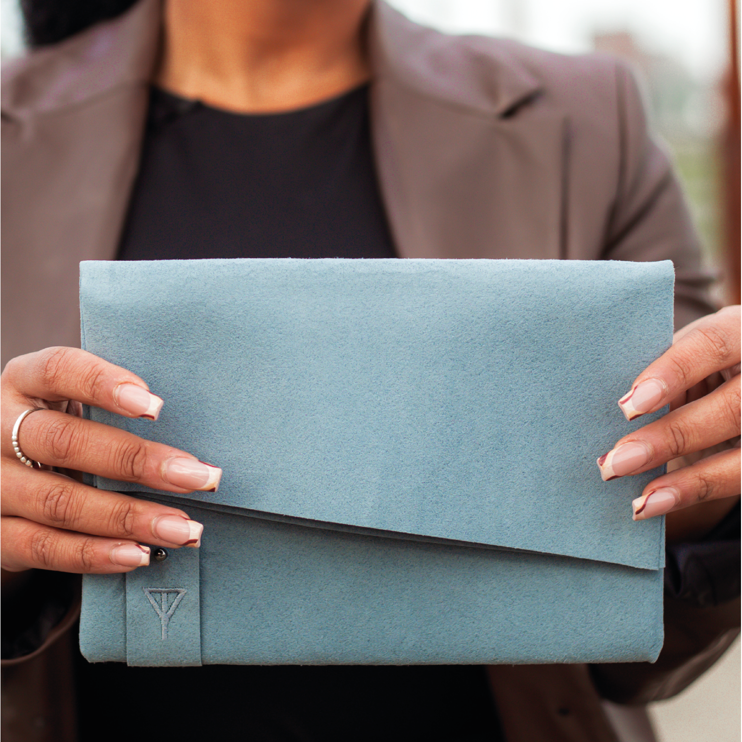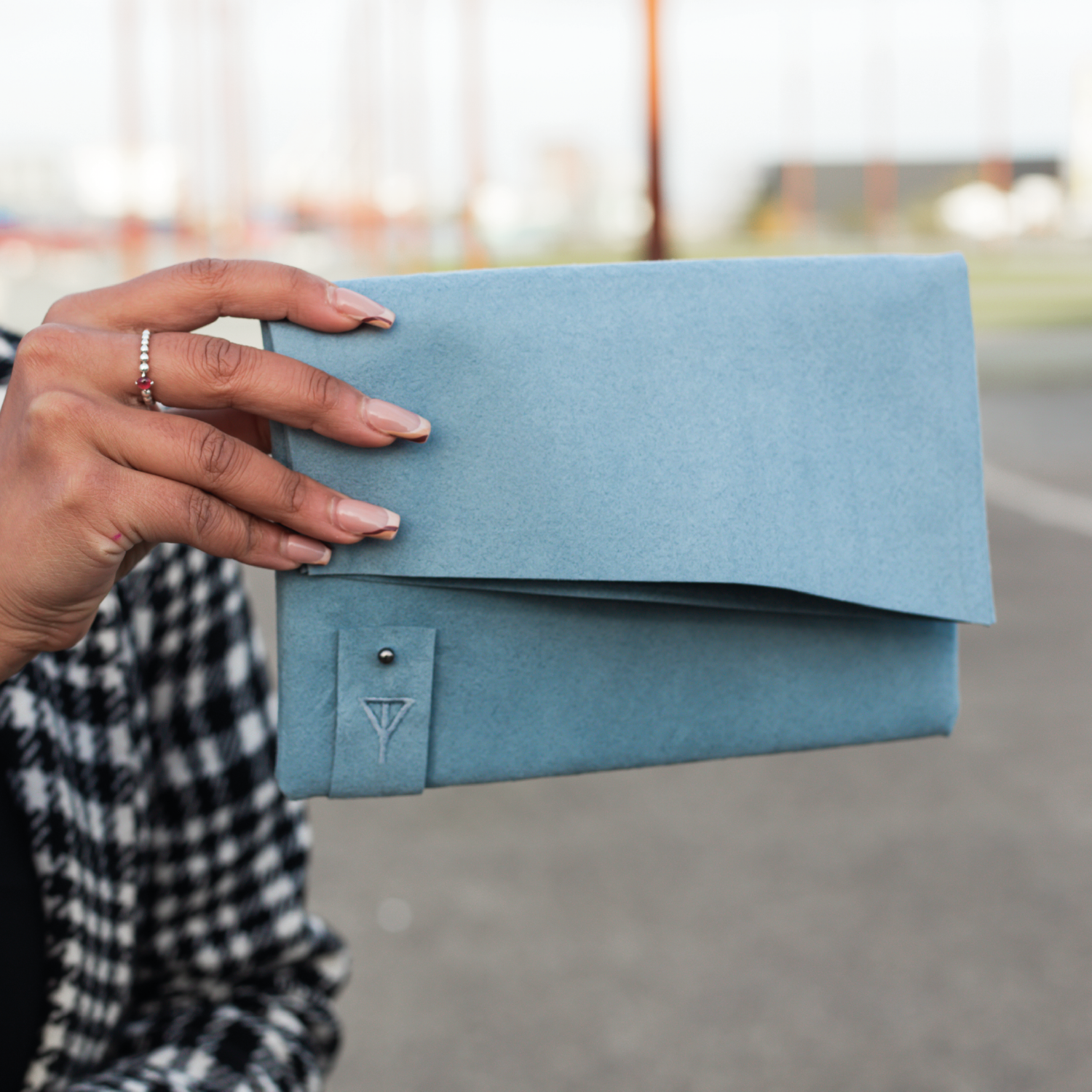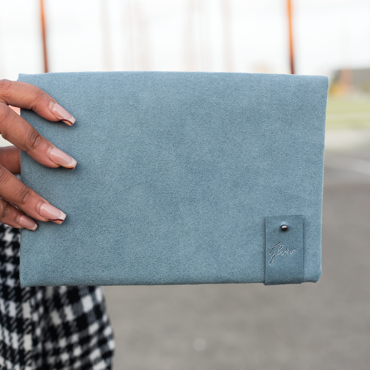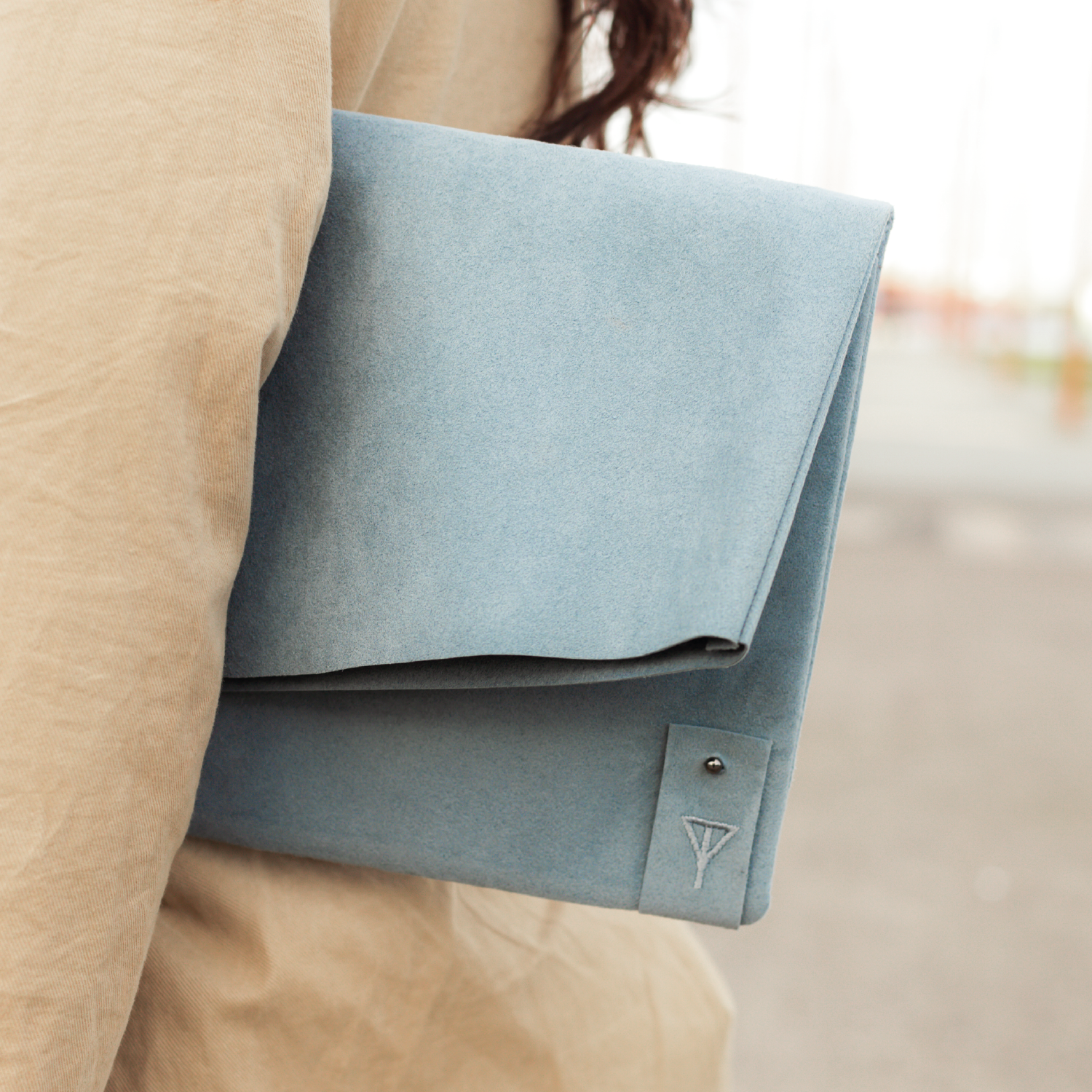 Handmade in Northern Ireland, this clutch is made from Alcantara and lined with a cotton blend fabric also made in Northern Ireland. The branding is a minimal embroidered tab with the Taylor Yates logo on the front and the GlowNI logo on the back.